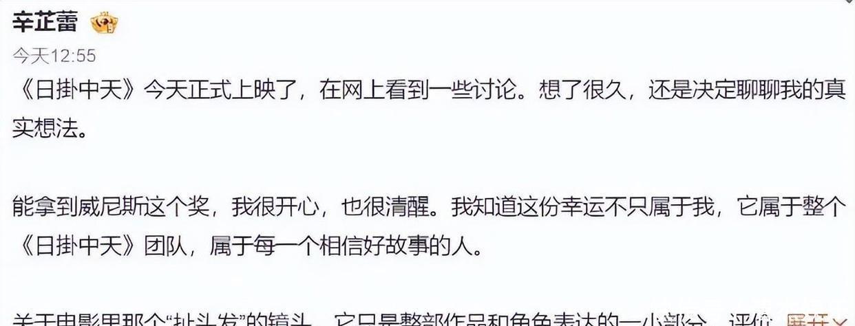 郝蕾这段话明显是在暗示辛芷蕾这奖得得不太干净,辛姐当然受不了,马上发了一篇长长的声明来澄清了这事。